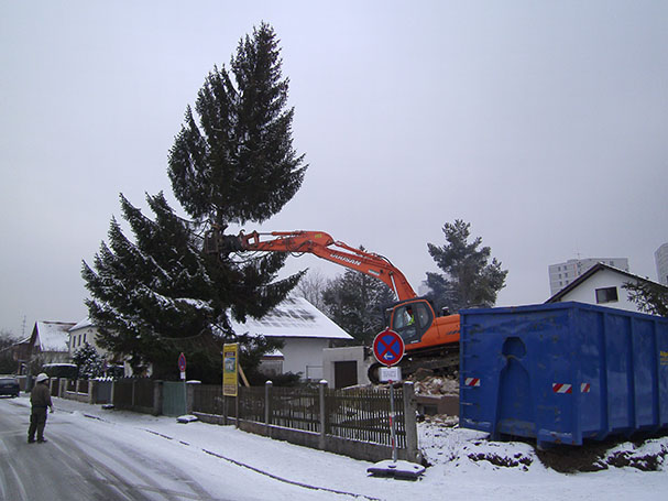 Als Zusatzleistung zu den Abbrucharbeiten werden Bäume wie hier in München – Großhadern gefällt.
