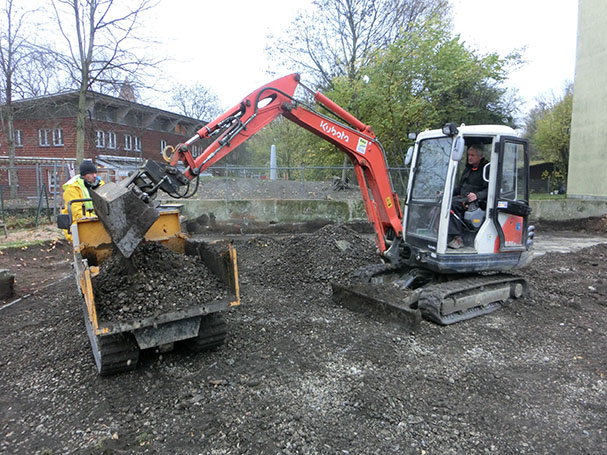 Minibagger und Gummikettendumper in der Dachauer Straße im Einsatz.